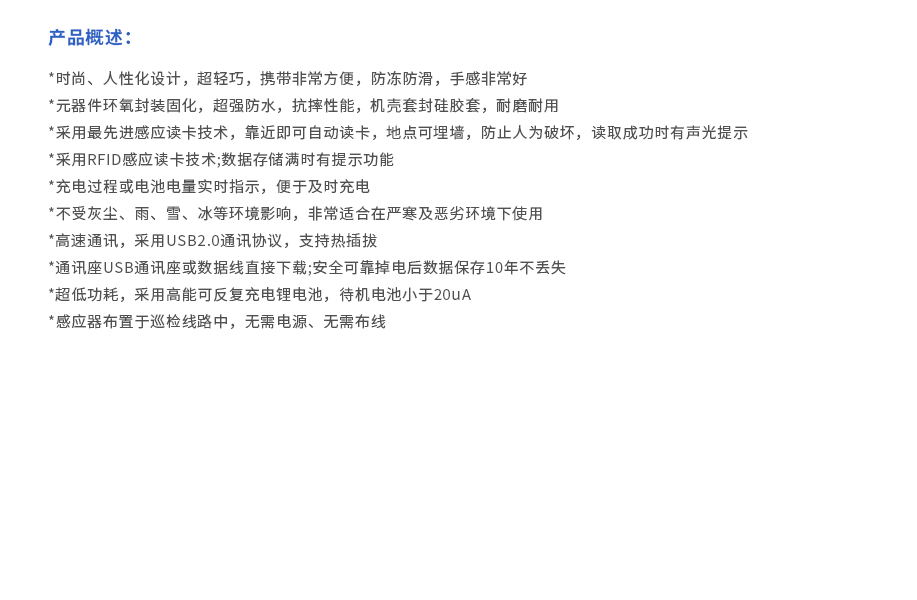 采用最先進感應(yīng)讀卡技術(shù),靠近即可自動讀卡,地點可埋墻,防止人為破壞,讀取成功時有聲光提示