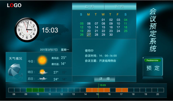 隨著社會(huì)的發(fā)展,會(huì)議預(yù)約管理系統(tǒng)在近年來呈現(xiàn)高速發(fā)展,但是各種等級層次不齊?,F(xiàn)代辦公會(huì)議室是組織的公共資源,會(huì)議室及其附屬的設(shè)備構(gòu)成召開會(huì)議的基礎(chǔ)環(huán)境。廣州朗歌公司以提高會(huì)議效率為焦點(diǎn),以會(huì)議全過程管理為理念,開發(fā)了會(huì)議預(yù)定管理系統(tǒng)產(chǎn)品。會(huì)議室預(yù)約管理系統(tǒng)的目標(biāo)是為會(huì)議的準(zhǔn)備提供便捷的服務(wù),實(shí)時(shí)動(dòng)態(tài)的將會(huì)議室預(yù)定信息,傳遞到每個(gè)會(huì)議室門口、大廳及樓梯口等公共通道的顯示屏上,實(shí)現(xiàn)會(huì)議信息發(fā)布引導(dǎo)功能為會(huì)議的召開提供順暢環(huán)境。