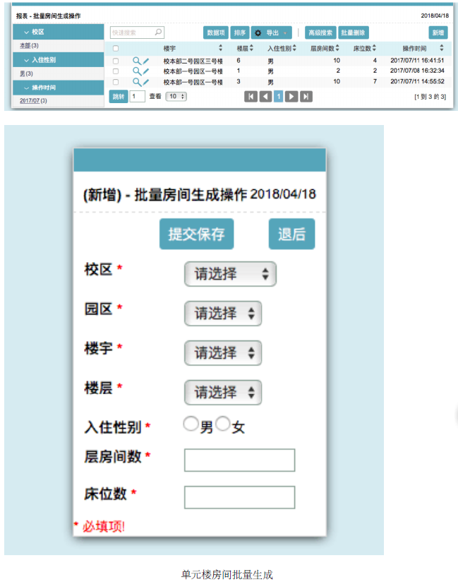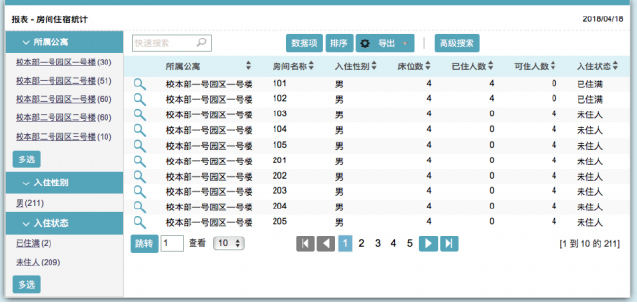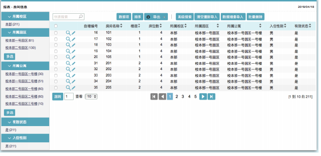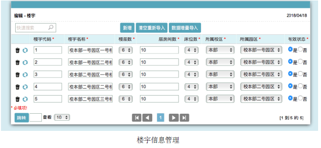 樓宇信息管理:維護校區(qū)內(nèi)宿舍樓宇信息,包括樓宇層數(shù)、層房間數(shù)、床位數(shù)、所屬校區(qū)等信息。
